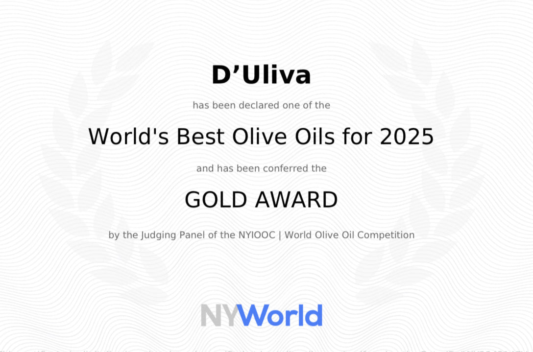 D'uliva won the Gold Award at the NYIOOC World Olive Oil Competition